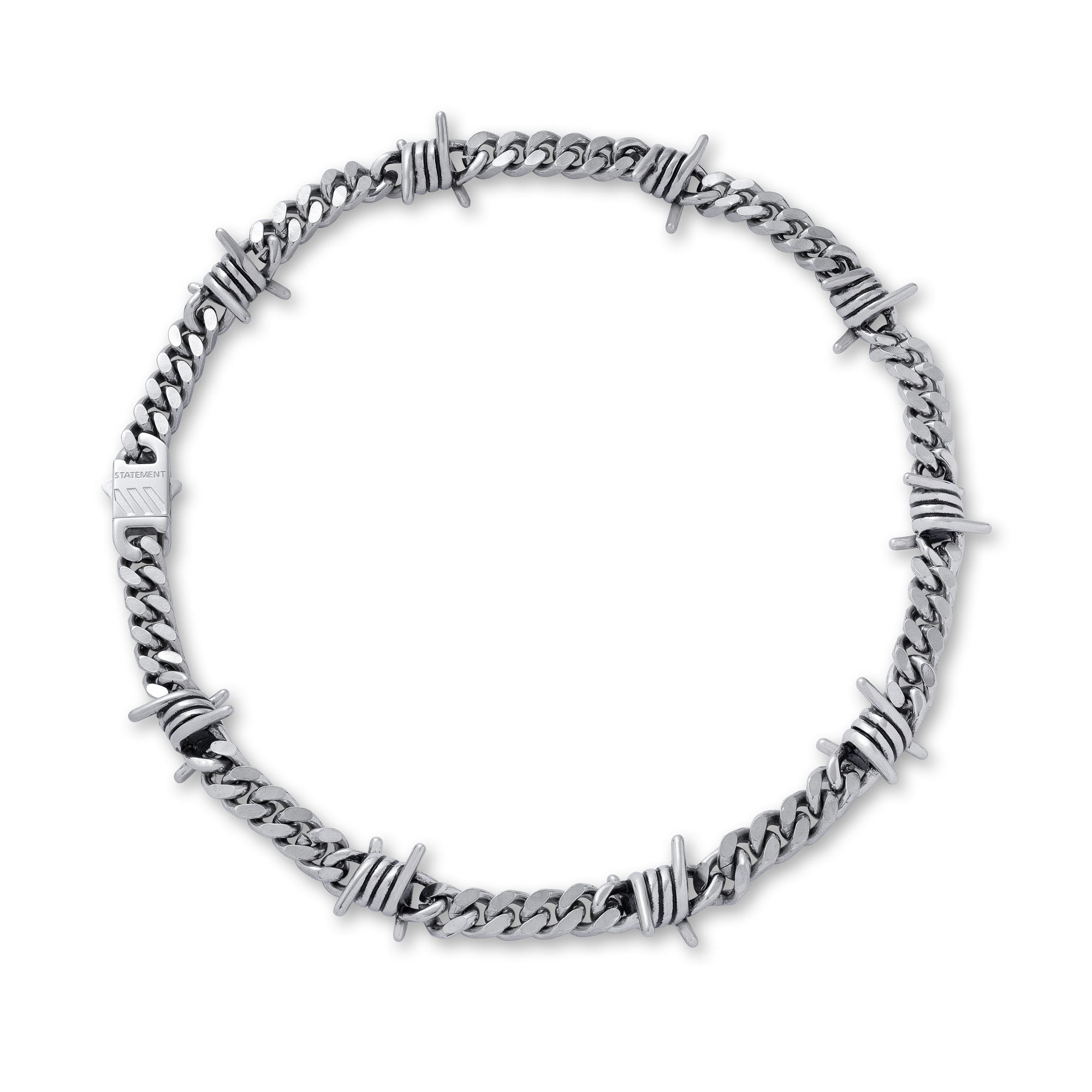 An instant classic! This barbed wire necklace was carefully engineered to interlace barbed wire pendants throughout the length of the 9mm cuban links.