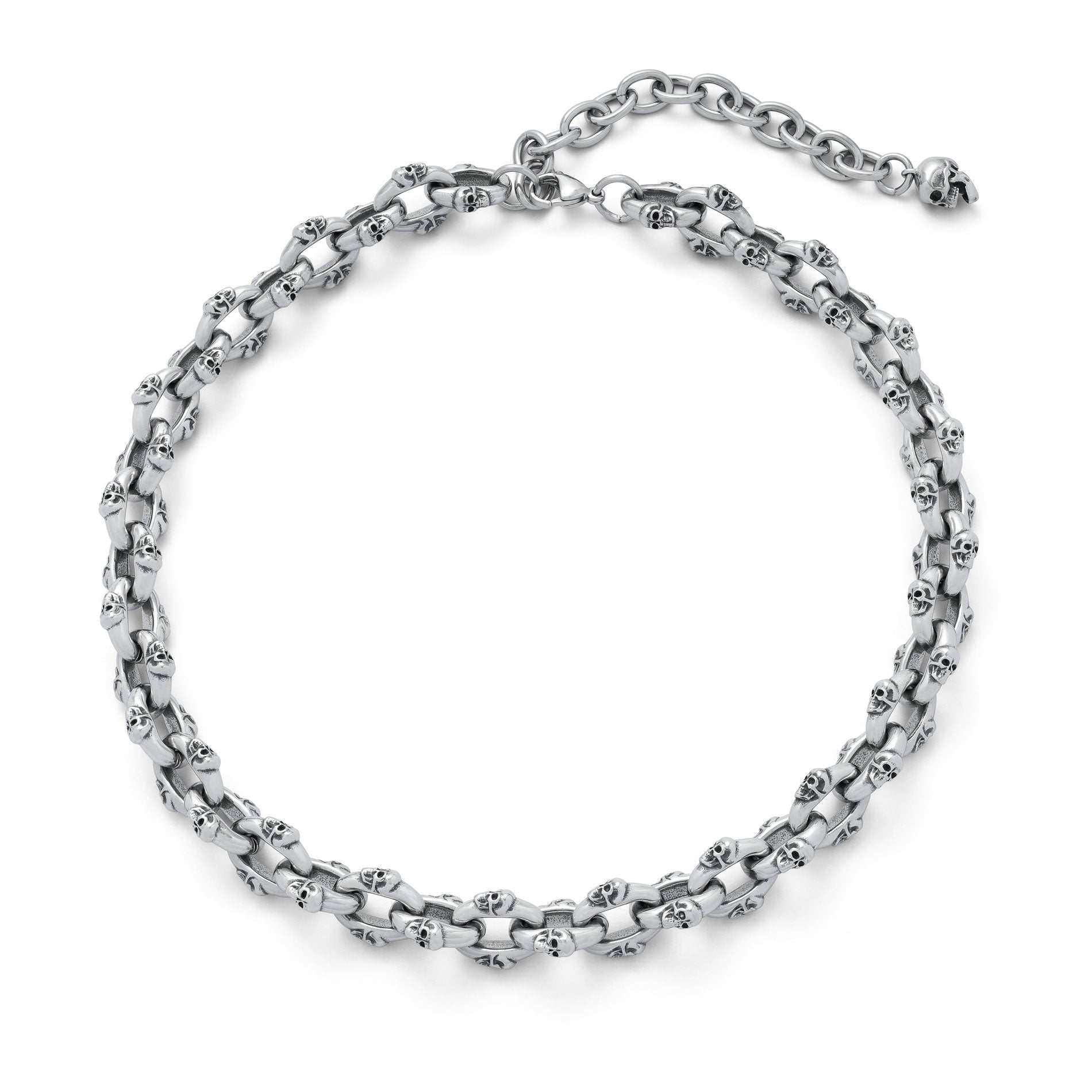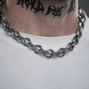 Introducing the new Boneyards chain link design, a brand new statement chain style. The Boneyards pieces feature a thick 12mm wide cable chain link with skulls molded to the sides of each link, creating the skull chain look.