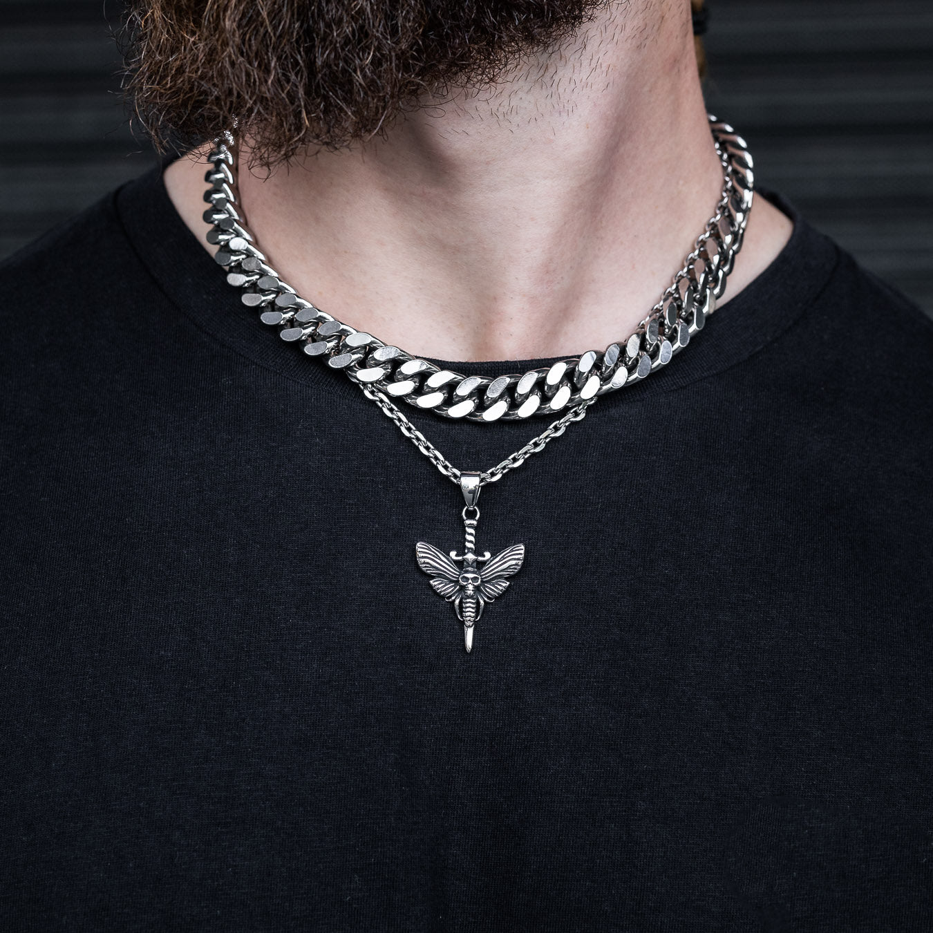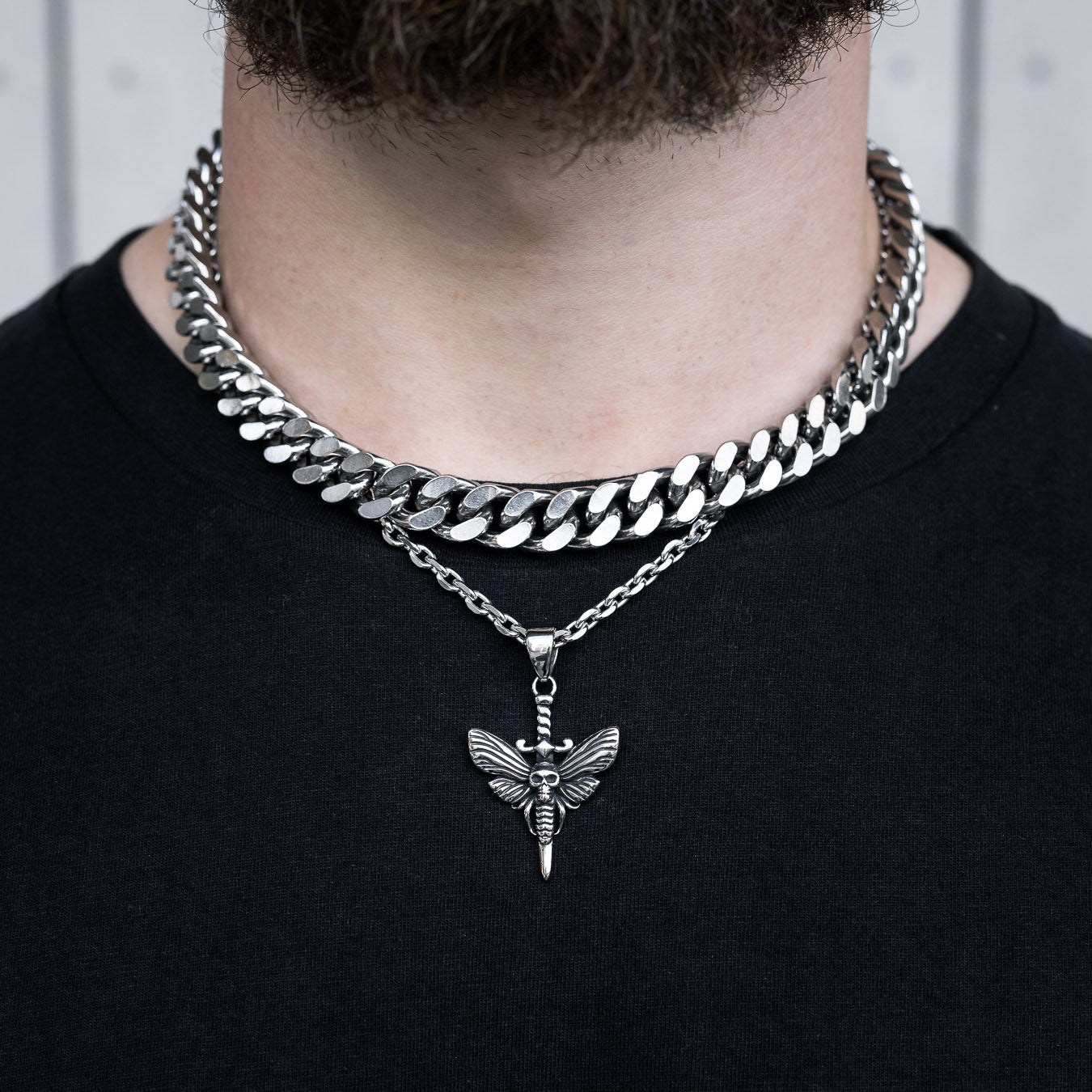A striking death’s head moth, pierced by a dagger with widespread wings.