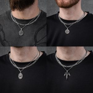 The Figaro link chain has an elegant and classic vibe on it’s own, but stacked together with a pendant on a thinner figaro chain really ties the look together into one hell of a stylish set.