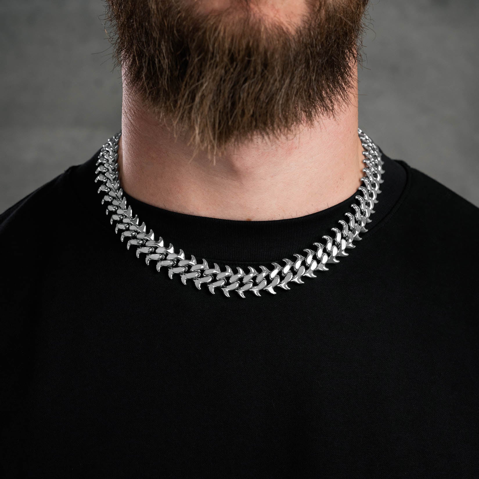 Built using our signature custom Cuban links in tough, polished 316L stainless steel, this piece features sharp spikes that possess a subtle, dynamic curve resembling the curves of a fish spine. It’s a refined take on raw rebellion, adding a unique flow to the inherent brutalist strength.