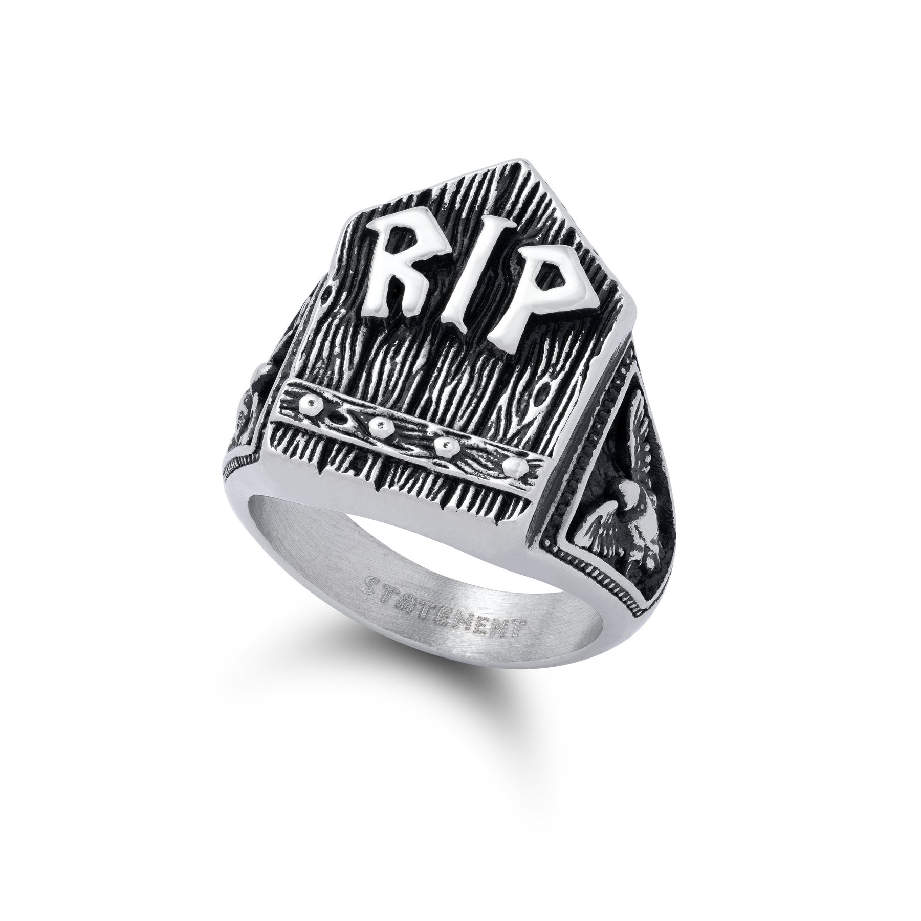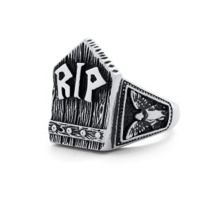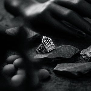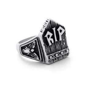 The Gravestone ring for your macabre aesthetic is here. This grim creation features an aged wooden gravestone face with crypt angels embedded onto the ring shoulders.
