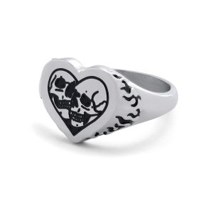 Introducing our new Skull Heart Ring where we make love and death collide. This striking heart-shaped ring, featuring 2 bold skulls right at its center seamlessly blends gothic charm with a touch of dark romance.