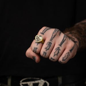 Love & death collide in this striking heart-shaped ring. Now in 18k gold plated on 316L Stainless Steel, the Skull Heart ring features 2 skulls in its center.