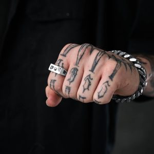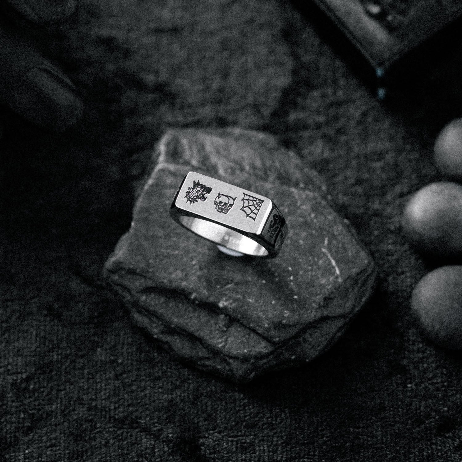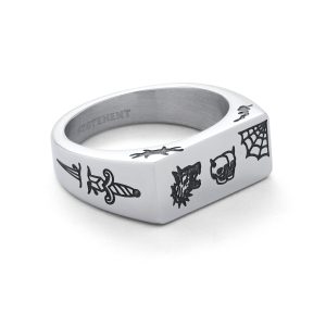 Tattoo Signet is a slimline ring covered in flash tattoo engravings. 7mm high x 17mm wide for a comfortable fit. 100% waterproof & hypoallergenic