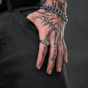 Tattoo Signet is a slimline ring covered in flash tattoo engravings. 7mm high x 17mm wide for a comfortable fit. 100% waterproof & hypoallergenic