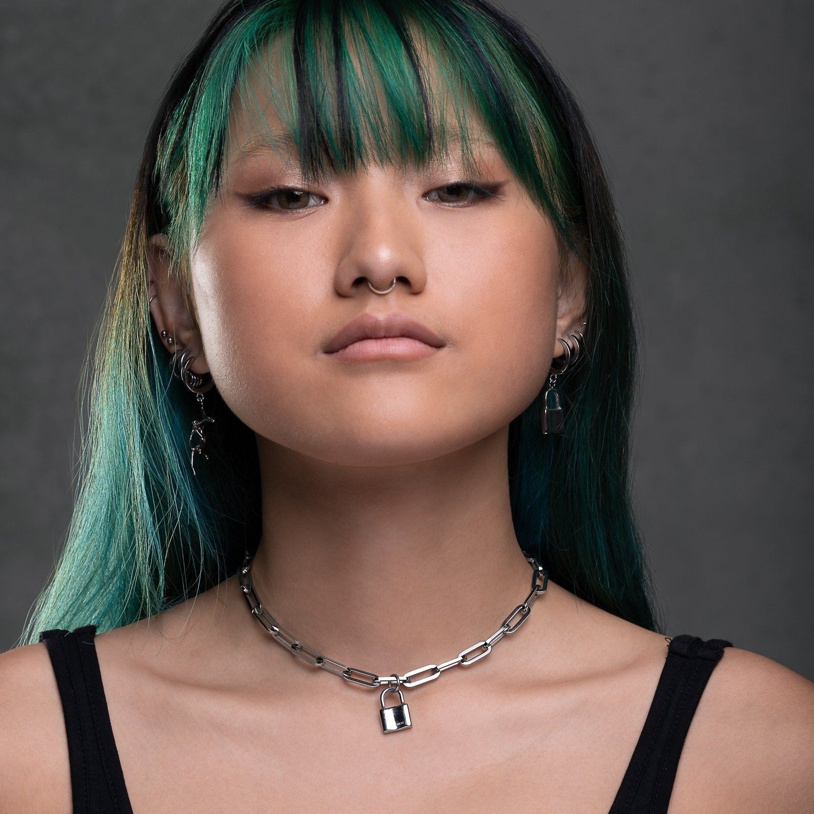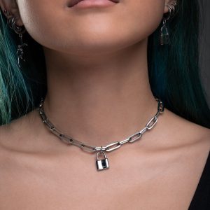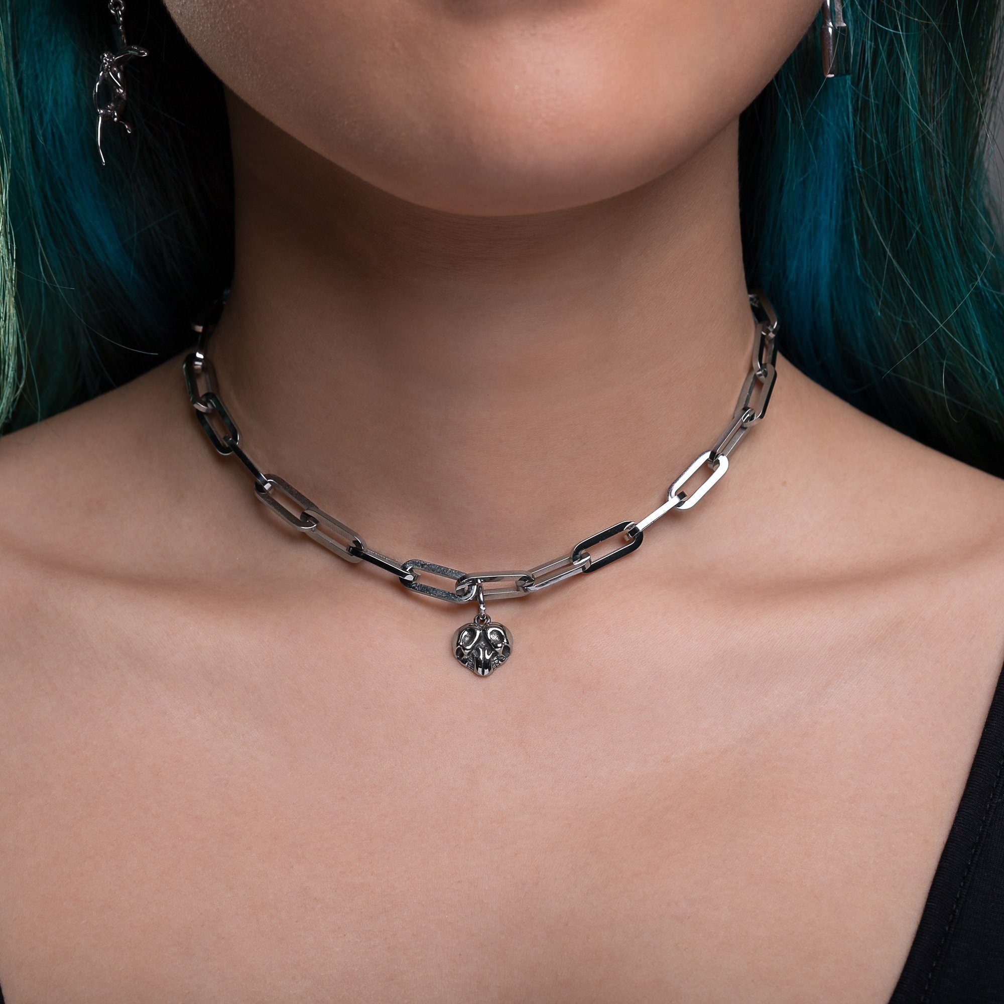 Featuring our paperclip choker chain and your choice of either a mini padlock or skull heart pendant attached.