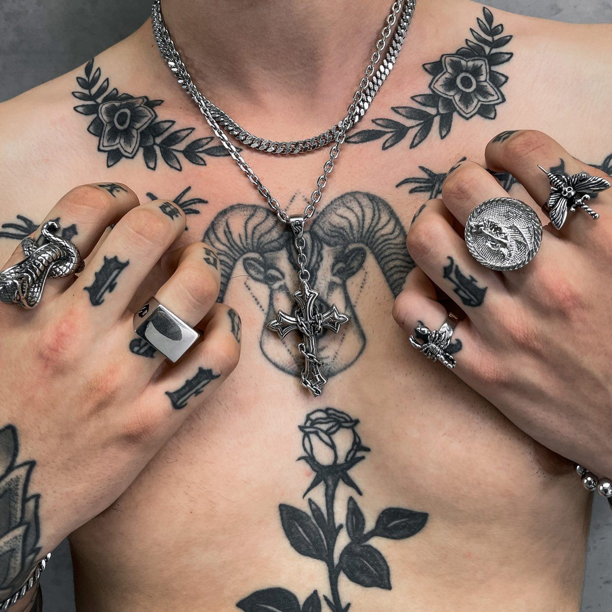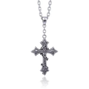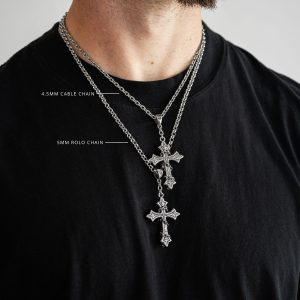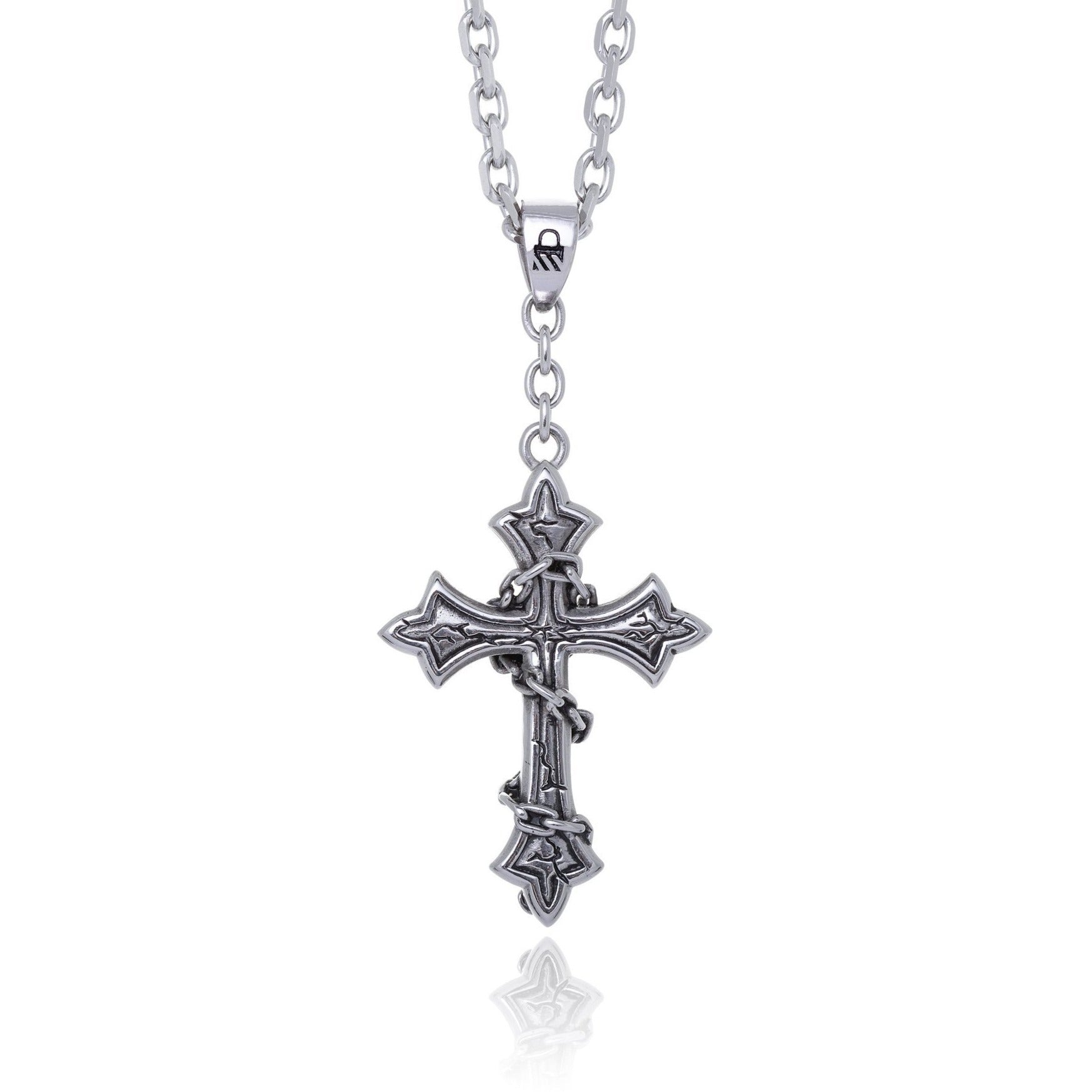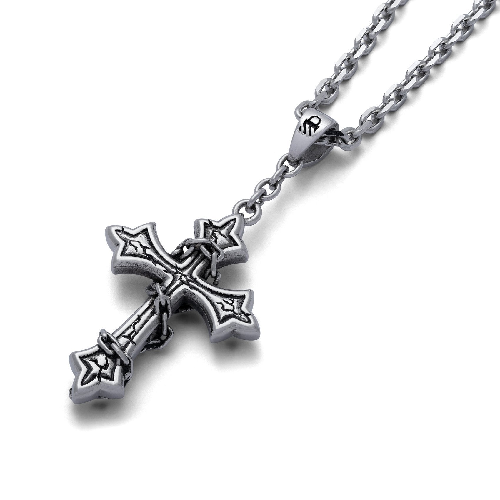 This large cross pendant features a highly detailed chain that wraps around the entire piece, the cross itself is 50mm high and hangs from the bail with an extended length of chain.