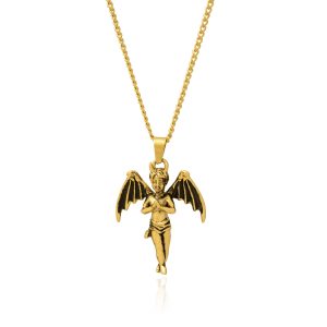 The pendant design features a cherub with its hands clasped, the angel wings have been replaced with horned devil wings and horns atop the cherub’s head.